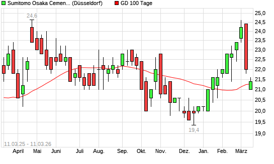Mit dem Anstieg auf 21,60 EUR hat die Sumitomo Osaka Cement-Aktie am 10.03.2026 die 100-Tage-Linie nach oben gekreuzt.