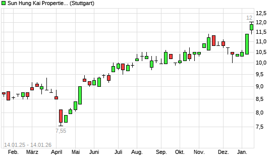 Mit dem Anstieg auf 11,80 EUR hat die Sun Hung Kai Properties-Aktie (ISIN HK0016000132) am 13.01.2026 ein neues 12-Monats-Hoch erreicht und damit den Kurs vom 12.01.2026 eingestellt.