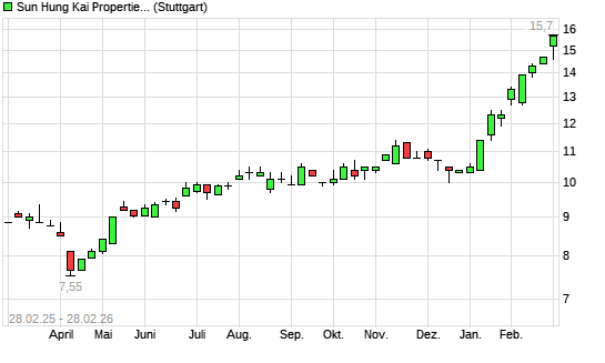 Mit dem Anstieg auf 15,70 EUR hat die Sun Hung Kai Properties-Aktie (ISIN HK0016000132) am 27.02.2026 ein neues 5-Jahres-Hoch erreicht und damit den Kurs vom 23.02.2026 eingestellt.