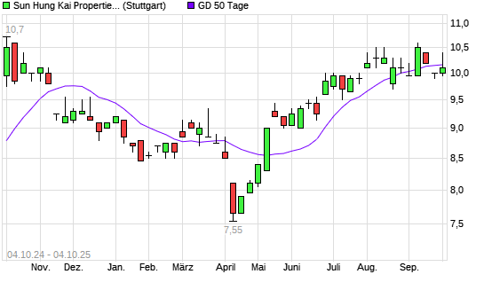 Mit dem Rücksetzer auf 10,10 EUR hat die Sun Hung Kai Properties-Aktie am 03.10.2025 die 50-Tage-Linie nach unten gekreuzt.