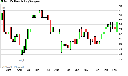 Mit dem Anstieg auf 54,50 EUR hat die Sun Life Financial-Aktie (ISIN CA8667961053) am 04.02.2026 ein neues 6-Monats-Hoch erreicht und damit den Kurs vom 06.01.2026 eingestellt.