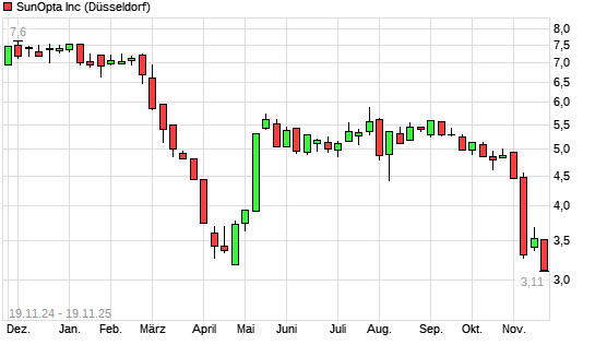 Mit dem Rücksetzer auf 3,02 EUR hat die SunOpta-Aktie (ISIN CA8676EP1086) am 18.11.2025 ein neues 12-Monats-Tief erreicht und damit den Kurs vom 17.11.2025 eingestellt.