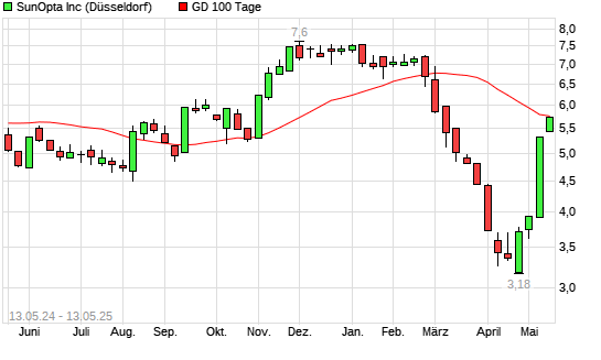 Mit dem Anstieg auf 5,71 EUR hat die SunOpta-Aktie am 12.05.2025 die 100-Tage-Linie nach oben gekreuzt.