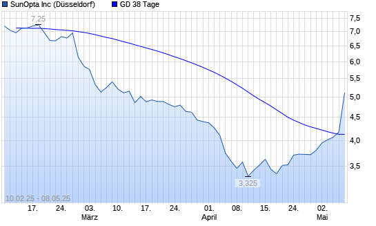 Mit dem Rücksetzer auf 3,89 EUR hat die SunOpta-Aktie am 07.05.2025 die 38-Tage-Linie nach unten gekreuzt.