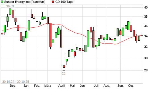 Mit dem Rücksetzer auf 33,96 EUR hat die Suncor Energy-Aktie am 29.10.2025 die 100-Tage-Linie nach unten gekreuzt.