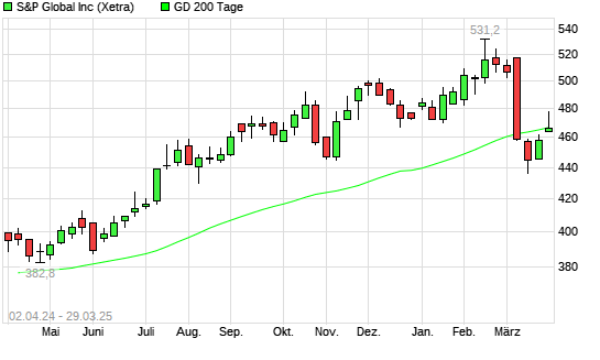 Mit dem Rücksetzer auf 466,30 EUR hat die S&P Global-Aktie am 28.03.2025 die 200-Tage-Linie nach unten gekreuzt.