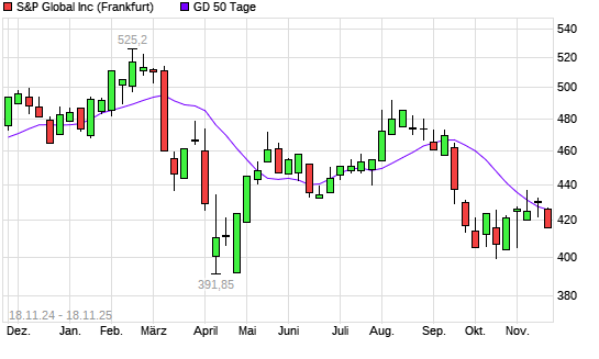 Mit dem Rücksetzer auf 421,85 EUR hat die S&P Global-Aktie am 17.11.2025 die 50-Tage-Linie nach unten gekreuzt.