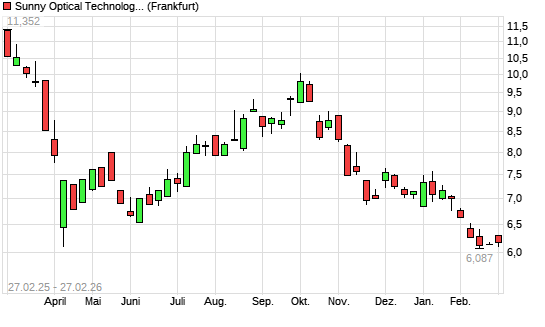 Mit dem Rücksetzer auf 6,09 EUR hat die Sunny Optical-Aktie (ISIN KYG8586D1097) am 26.02.2026 ein neues 12-Monats-Tief erreicht und damit den Kurs vom 07.04.2025 eingestellt.