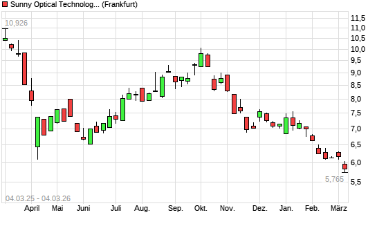 Mit dem Rücksetzer auf 5,81 EUR hat die Sunny Optical-Aktie (ISIN KYG8586D1097) am 03.03.2026 ein neues 12-Monats-Tief erreicht und damit den Kurs vom 02.03.2026 eingestellt.