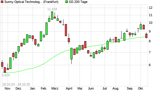 Mit dem Rücksetzer auf 8,36 EUR hat die Sunny Optical-Aktie am 17.10.2025 die 200-Tage-Linie nach unten gekreuzt.