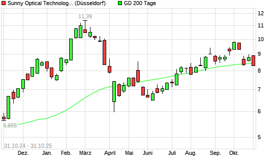 Mit dem Rücksetzer auf 8,45 EUR hat die Sunny Optical-Aktie am 30.10.2025 die 200-Tage-Linie nach unten gekreuzt.