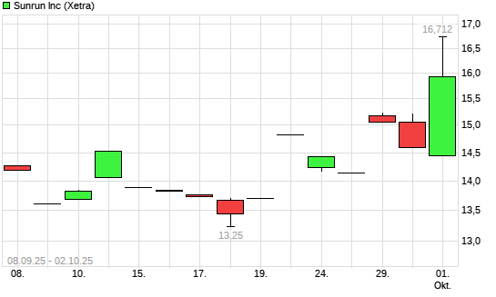 Mit dem Anstieg auf 15,56 EUR hat die Sunrun-Aktie (ISIN US86771W1053) am 01.10.2025 ein neues 6-Monats-Hoch erreicht und damit den Kurs vom 05.09.2025 eingestellt.