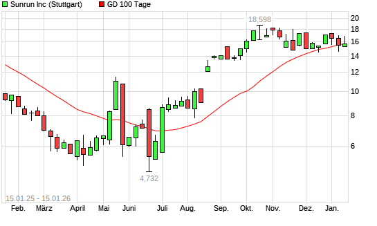 Mit dem Rücksetzer auf 15,76 EUR hat die Sunrun-Aktie am 14.01.2026 die 100-Tage-Linie nach unten gekreuzt.