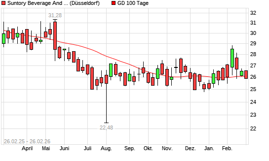 Mit dem Rücksetzer auf 26,08 EUR hat die Suntory Beverage & Food-Aktie am 25.02.2026 die 100-Tage-Linie nach unten gekreuzt.