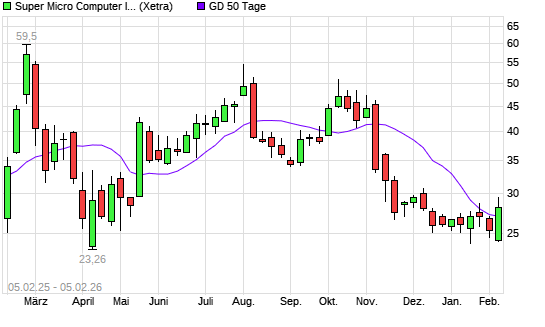 Mit dem Anstieg auf 28,71 EUR hat die Super Micro Computer-Aktie am 04.02.2026 die 50-Tage-Linie nach oben gekreuzt.