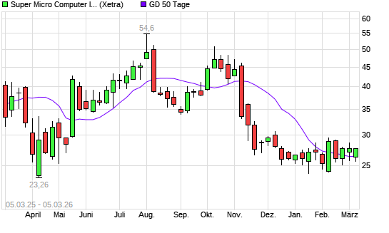 Mit dem Anstieg auf 27,94 EUR hat die Super Micro Computer-Aktie am 04.03.2026 die 50-Tage-Linie nach oben gekreuzt.