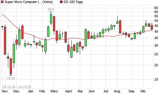 Mit dem Rücksetzer auf 41,26 EUR hat die Super Micro Computer-Aktie am 23.10.2025 die 100-Tage-Linie nach unten gekreuzt.
