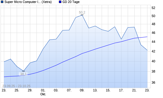 Mit dem Rücksetzer auf 44,80 EUR hat die Super Micro Computer-Aktie am 22.10.2025 die 20-Tage-Linie nach unten gekreuzt.