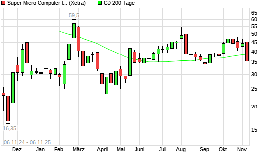 Mit dem Rücksetzer auf 36,76 EUR hat die Super Micro Computer-Aktie am 05.11.2025 die 200-Tage-Linie nach unten gekreuzt.