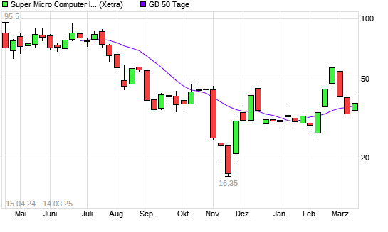 Mit dem Rücksetzer auf 35,98 EUR hat die Super Micro Computer-Aktie am 13.03.2025 die 50-Tage-Linie nach unten gekreuzt.