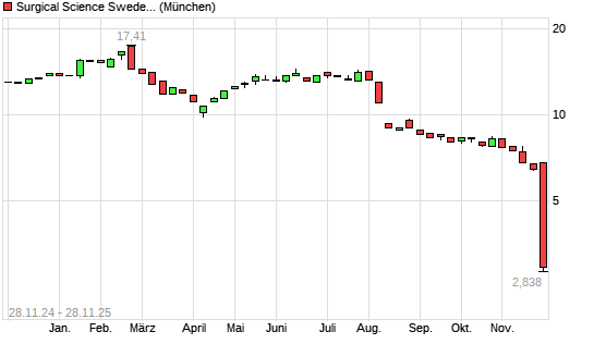 Mit dem Rücksetzer auf 2,84 EUR hat die Surgical Science Sweden-Aktie (ISIN SE0014428512) am 27.11.2025 ein neues All-Time-Low erreicht und damit den Kurs vom 24.03.2020 eingestellt.