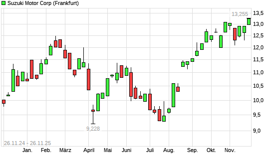 Mit dem Anstieg auf 13,26 EUR hat die Suzuki Motor-Aktie (ISIN JP3397200001) am 25.11.2025 ein neues 5-Jahres-Hoch erreicht und damit den Kurs vom 24.10.2025 eingestellt.