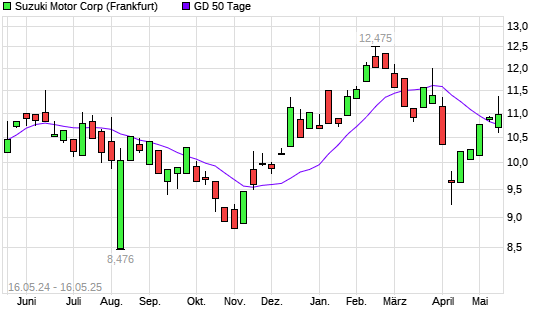 Mit dem Rücksetzer auf 10,61 EUR hat die Suzuki Motor-Aktie am 15.05.2025 die 50-Tage-Linie nach unten gekreuzt.