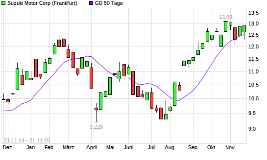 Mit dem Rücksetzer auf 12,35 EUR hat die Suzuki Motor-Aktie am 20.11.2025 die 50-Tage-Linie nach unten gekreuzt.