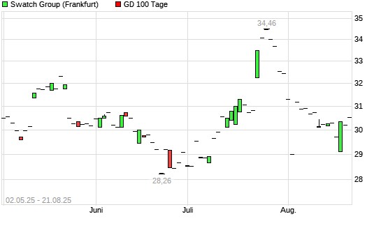 Mit dem Rücksetzer auf 30,20 EUR hat die Swatch Group-Aktie am 20.08.2025 die 100-Tage-Linie nach unten gekreuzt.