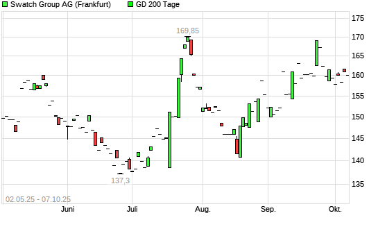 Mit dem Anstieg auf 160,90 EUR hat die Swatch Group Inhaber-Aktien-Aktie am 06.10.2025 die 200-Tage-Linie nach oben gekreuzt.