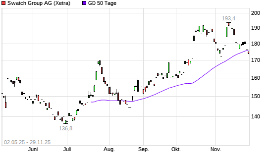 Mit dem Rücksetzer auf 174,65 EUR hat die Swatch Group Inhaber-Aktien-Aktie am 28.11.2025 die 50-Tage-Linie nach unten gekreuzt.