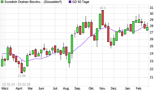 Mit dem Anstieg auf 28,20 EUR hat die Swedish Orphan Biovi-Aktie am 21.02.2025 die 50-Tage-Linie nach oben gekreuzt.