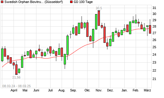 Mit dem Rücksetzer auf 27,10 EUR hat die Swedish Orphan Biovi-Aktie am 07.03.2025 die 100-Tage-Linie nach unten gekreuzt.