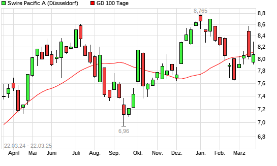 Mit dem Rücksetzer auf 8,01 EUR hat die Swire Pacific A-Aktie am 21.03.2025 die 100-Tage-Linie nach unten gekreuzt.