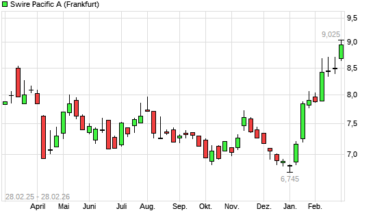 Mit dem Anstieg auf 8,95 EUR hat die Swire Pacific A-Aktie (ISIN HK0019000162) am 27.02.2026 ein neues 5-Jahres-Hoch erreicht und damit den Kurs vom 25.02.2026 eingestellt.Die ...weiterlesen