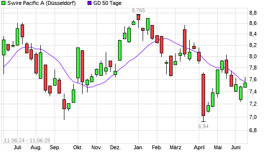 Mit dem Anstieg auf 7,56 EUR hat die Swire Pacific A-Aktie am 10.06.2025 die 50-Tage-Linie nach oben gekreuzt.Die Swire Pacific A-Aktie befindet sich seit dem 16.05.2025 im langfristigen Abwärtstrend ...weiterlesen