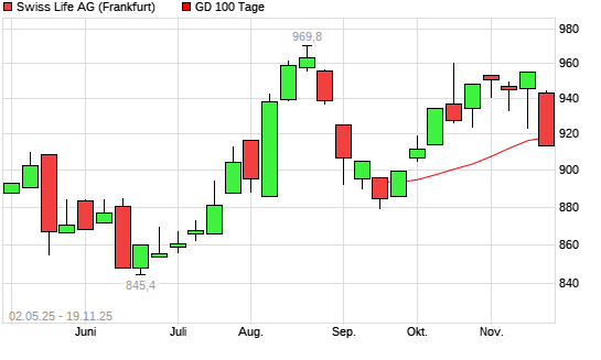 Mit dem Rücksetzer auf 913,80 EUR hat die Swiss Life-Aktie am 18.11.2025 die 100-Tage-Linie nach unten gekreuzt.