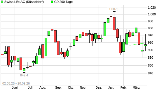 Mit dem Rücksetzer auf 920,00 EUR hat die Swiss Life-Aktie am 19.03.2026 die 200-Tage-Linie nach unten gekreuzt.