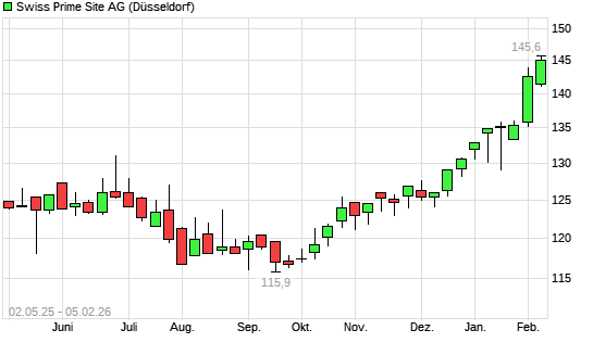 Mit dem Anstieg auf 143,30 EUR hat die Swiss Prime Site-Aktie (ISIN CH0008038389) am 04.02.2026 ein neues All-Time-High erreicht und damit den Kurs vom 30.01.2026 eingestellt.