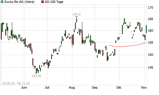 Mit dem Rücksetzer auf 154,80 EUR hat die Swiss Re-Aktie am 04.11.2025 die 100-Tage-Linie nach unten gekreuzt.