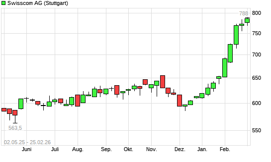 Mit dem Anstieg auf 788,50 EUR hat die Swisscom-Aktie (ISIN CH0008742519) am 24.02.2026 ein neues All-Time-High erreicht und damit den Kurs vom 19.02.2026 eingestellt.
