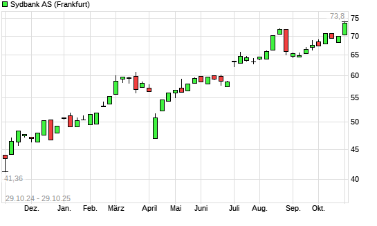 Mit dem Anstieg auf 73,80 EUR hat die Sydbank-Aktie (ISIN DK0010311471) am 28.10.2025 ein neues All-Time-High erreicht und damit den Kurs vom 21.08.2025 eingestellt.