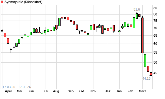 Mit dem Rücksetzer auf 45,32 EUR hat die Syensqo-Aktie (ISIN BE0974464977) am 16.03.2026 ein neues All-Time-Low erreicht und damit den Kurs vom 13.03.2026 eingestellt.