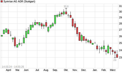 Mit dem Rücksetzer auf 23,20 EUR hat die Symrise ADR-Aktie (ISIN US87155N1090) am 13.03.2025 ein neues 12-Monats-Tief erreicht und damit den Kurs vom 05.03.2025 eingestellt.