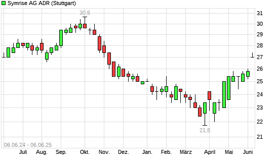 Mit dem Anstieg auf 27,40 EUR hat die Symrise ADR-Aktie (ISIN US87155N1090) am 05.06.2025 ein neues 6-Monats-Hoch erreicht und damit den Kurs vom 04.06.2025 eingestellt.
