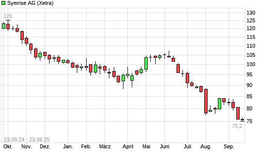 Mit dem Rücksetzer auf 75,50 EUR hat die Symrise-Aktie (ISIN DE000SYM9999) am 22.09.2025 ein neues 5-Jahres-Tief erreicht und damit den Kurs vom 19.09.2025 eingestellt.