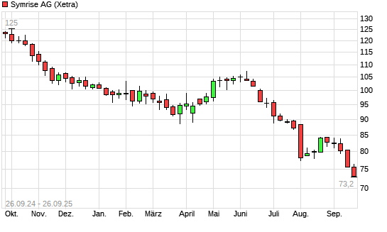 Mit dem Rücksetzer auf 72,36 EUR hat die Symrise-Aktie (ISIN DE000SYM9999) am 25.09.2025 ein neues 5-Jahres-Tief erreicht und damit den Kurs vom 22.09.2025 eingestellt.