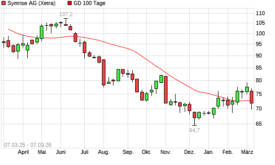 Mit dem Rücksetzer auf 71,80 EUR hat die Symrise-Aktie am 06.03.2026 die 100-Tage-Linie nach unten gekreuzt.