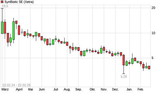 Mit dem Rücksetzer auf 3,71 EUR hat die SynBiotic-Aktie (ISIN DE000A3E5A59) am 21.02.2025 ein neues 12-Monats-Tief erreicht und damit den Kurs vom 17.02.2025 eingestellt.