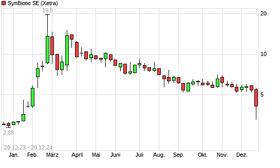 Mit dem Rücksetzer auf 4,20 EUR hat die SynBiotic-Aktie (ISIN DE000A3E5A59) am 19.12.2024 ein neues 6-Monats-Tief erreicht und damit den Kurs vom 17.12.2024 eingestellt.